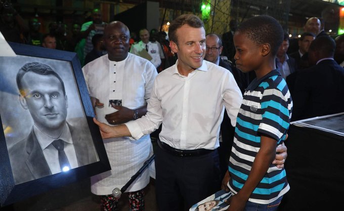 11 years old, Kareem Olamilekan artistically drew a portrait of president Emmanuel Macron of France during his visit to the New Afrikan Shrine in Lagos.